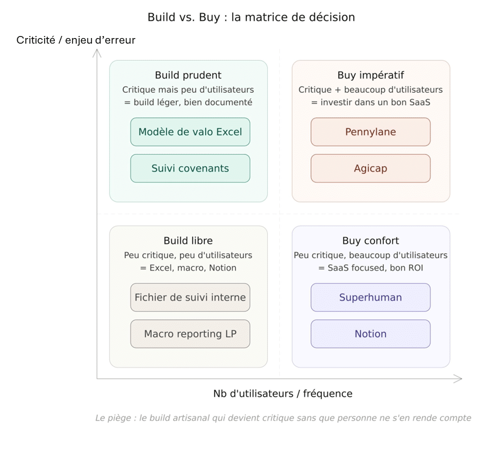 | Process unique à votre fonds, peu d’utilisateurs | Build (Excel, macro, Notion) |