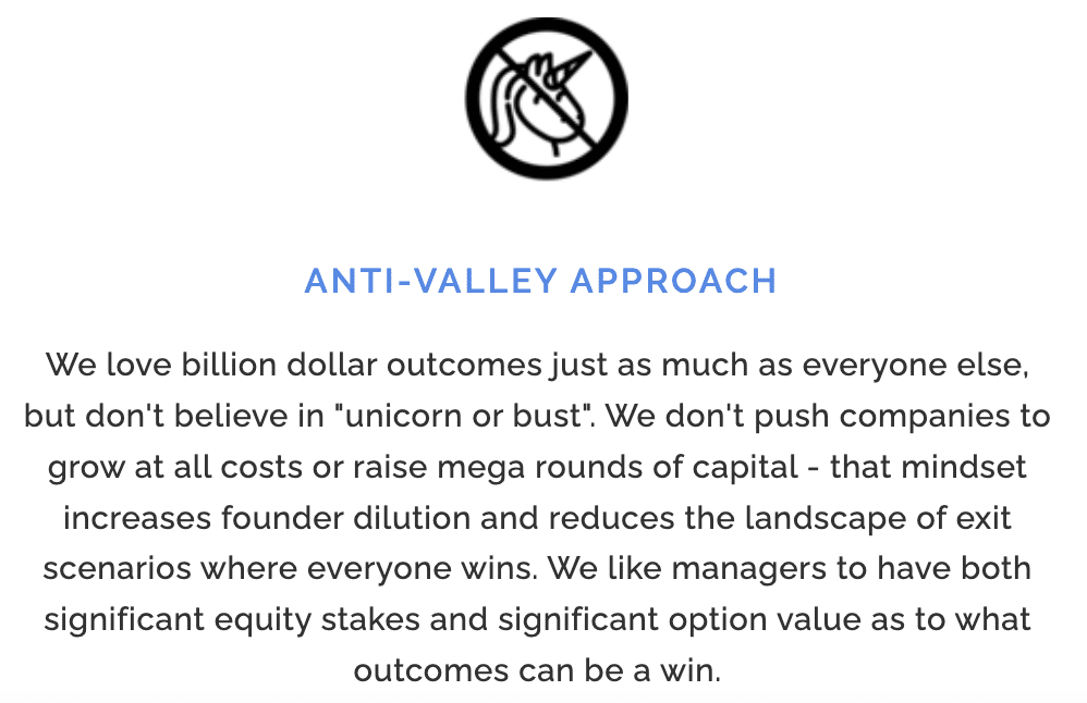 Un autre acteur américain qui mérite d’être mentionné est Five Elms Capital. Son approche “anti-Valley” est éloquente :