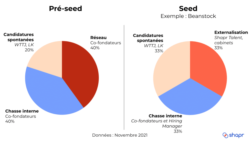 Une startup en pré-seed va concentrer la majorité de son sourcing sur des canaux à faibles coûts (faire appel à son réseau, prospecter par elle-même). Il lui sera quand même nécessaire d’investir une petite partie de son budget sur des jobs boards pour gagner en visibilité.