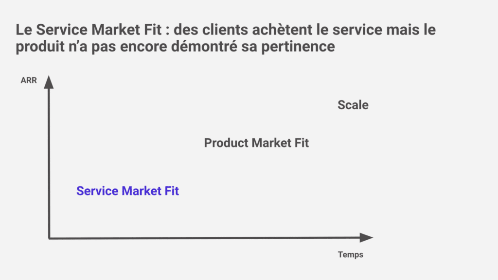 Le Graal pour les startups SaaS early stage est, après avoir testé plusieurs hypothèses, de passer le fameux Product Market Fit, lorsque suffisamment de clients sont prêts à acheter la solution et que le produit rencontre son marché. Le risque pour les tech-enabled services est de confondre ce moment avec le Service Market Fit, qui arrive très en amont lorsque des clients achètent le service que vous proposez. Il n’y a à ce moment aucune hypothèse validée ni de solution qui rencontre son marché, mais plutôt des clients qui achètent un service qui existe déjà sur le marché… La question clé qu’il faut se poser à ce moment-là : est-ce que le client achète vraiment le produit que vous construisez ou bien juste le service ? Est-ce que la technologie a déjà confirmé la thèse de départ et permet d’améliorer vraiment significativement le service ? Par exemple en automatisant une grande partie des actions réalisées à la main par un acteur traditionnel ? C’est uniquement à ce moment-là que l’on peut parler de Product Market Fit et qu’un acteur tech-enabled rencontre réellement son marché. Le risque pour les tech-enabled est de confondre ces 2 moments et de grandir trop vite avec toute la complexité qui va avec, de lever plusieurs millions et de se retrouver plusieurs mois ou années après avec un produit qui n’améliore pas vraiment la solution et qui n’a pas validé la thèse de départ.
